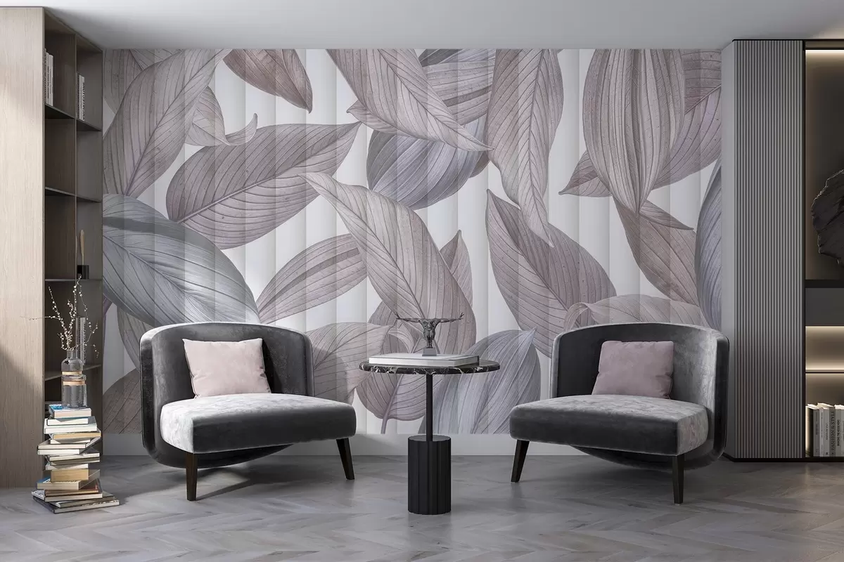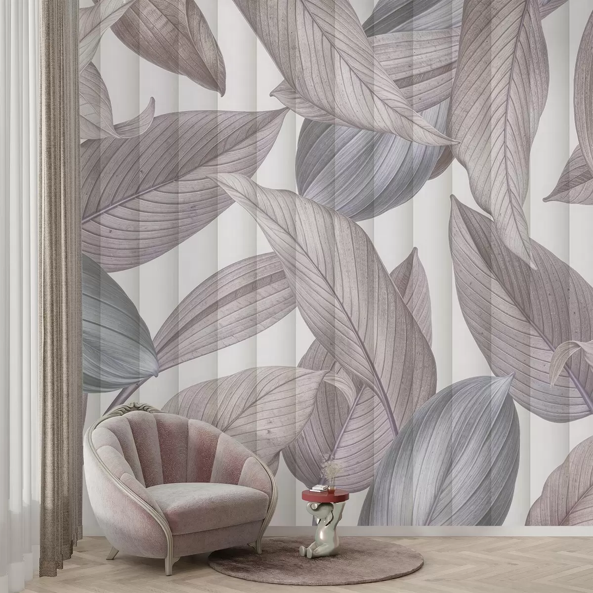 Fototapet Abstrakta detaljerade blad i nyanser av blått, grått och pastellrosa på en ljus bakgrund Nr. w08388v1