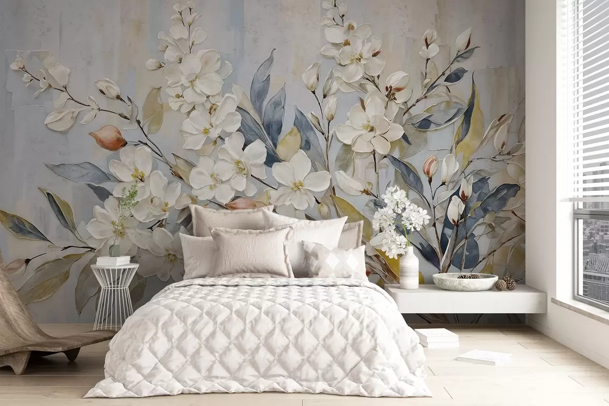 Fototapet Blommig pastellfärgad delikat vit blomma med gul mitt, omgiven av frodiga gröna blad och grenar Nr. w08399v1