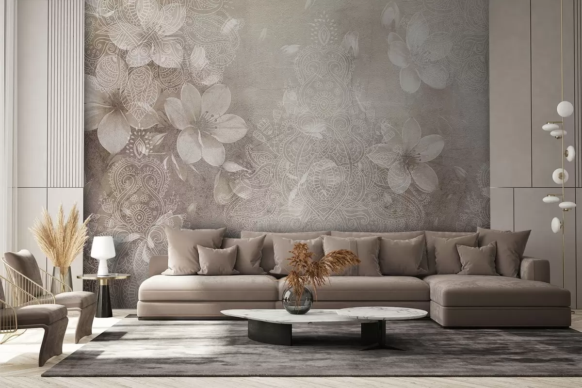 Fototapet Mjukt fokuserad teckning av skira vita blommor på en suddig texturerad spetsbeige bakgrund Nr. w08405v1