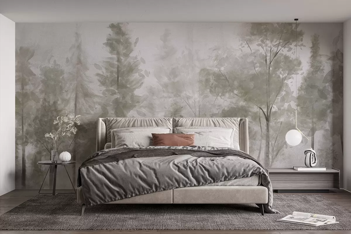 Fototapet Höga texturerade tallar i en dimmig skog, med en dimmig, disig atmosfär Nr. w08411