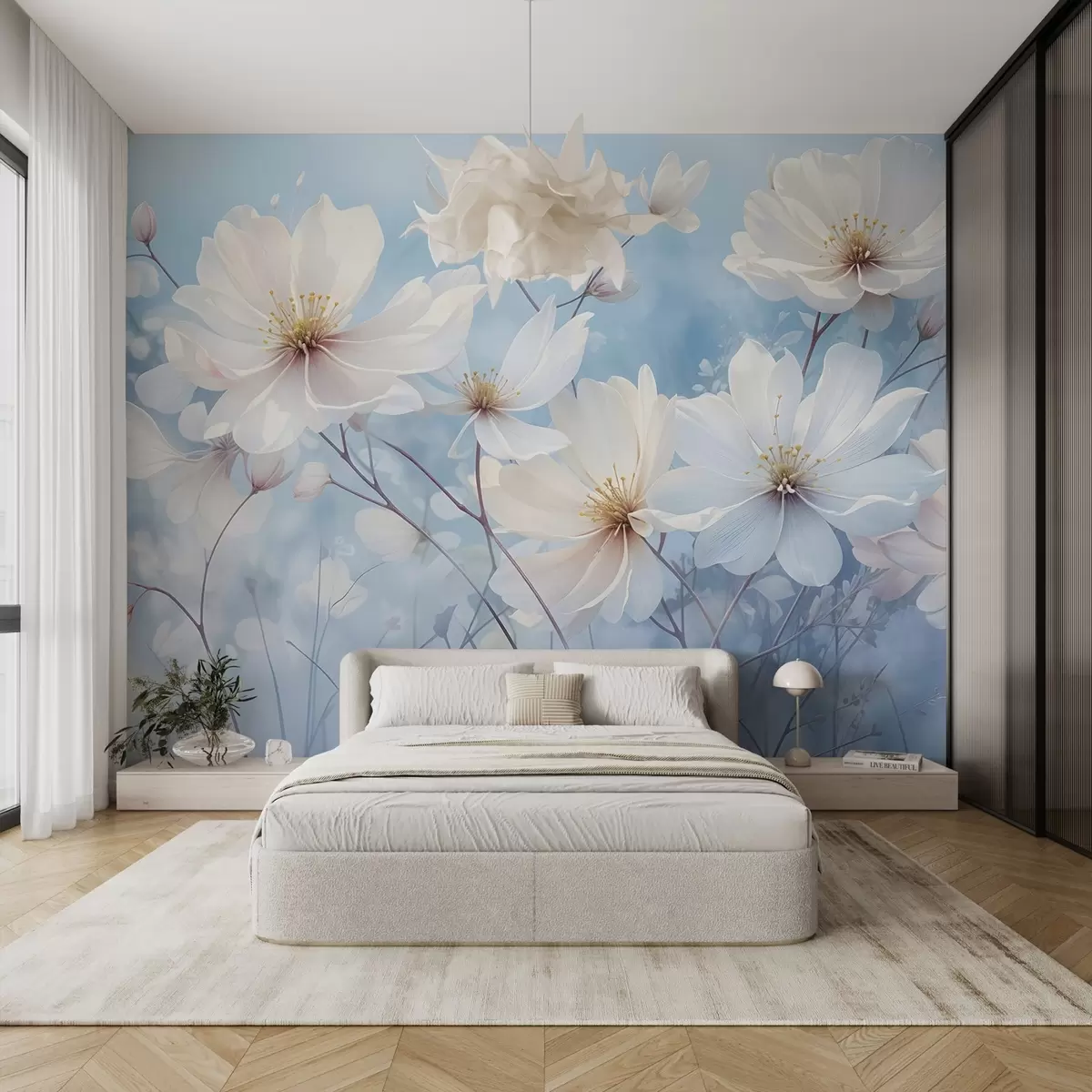 Fototapet Delikata vita blommor med mjuka kronblad mot en suddig blå bakgrund, vilket skapar en lugn och eterisk atmosfär Nr. w08412