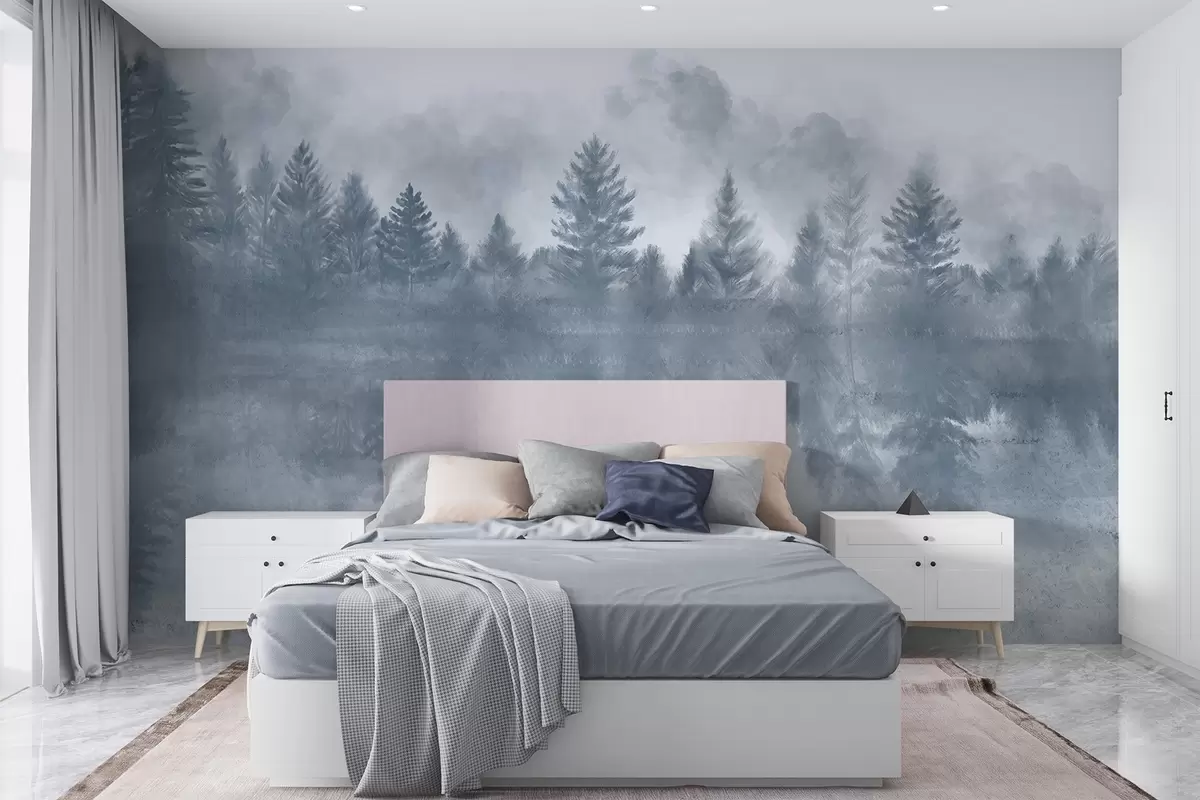 Fototapet Ett lugnt landskap med en frusen sjö omgiven av en tät tallskog, med en dimmig, dimmig atmosfär Nr. w08415