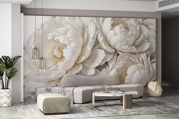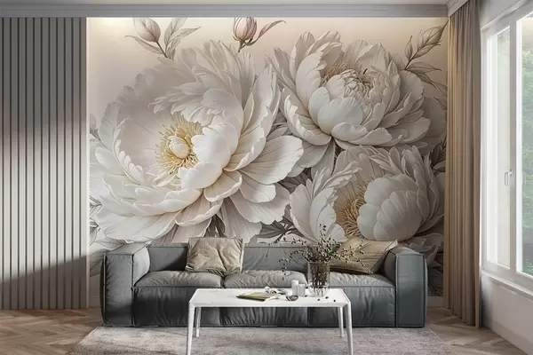Fototapet Fina pastellvita pioner med frodigt bladverk mot en mjuk, neutral bakgrund Nr. w08420