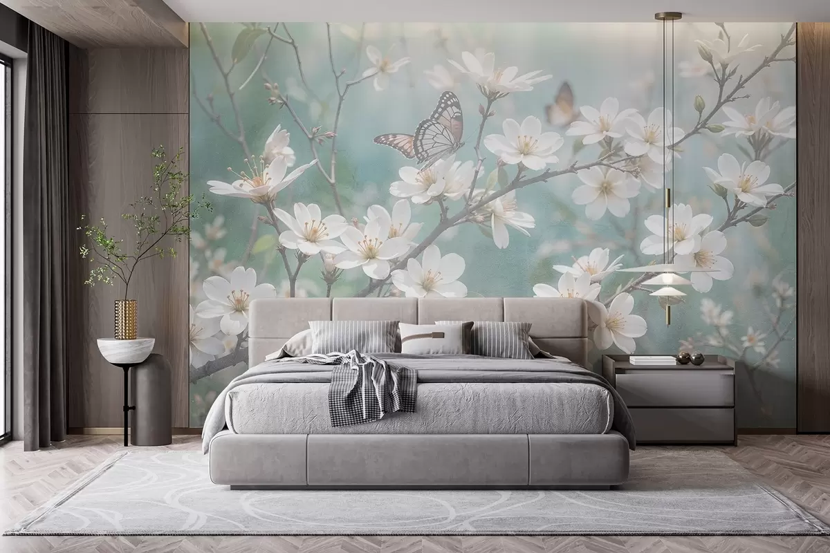 Fototapet En vit fjäril på en gren med skira vita körsbärsblommor i förgrunden mot en suddig bakgrund Nr. w08421