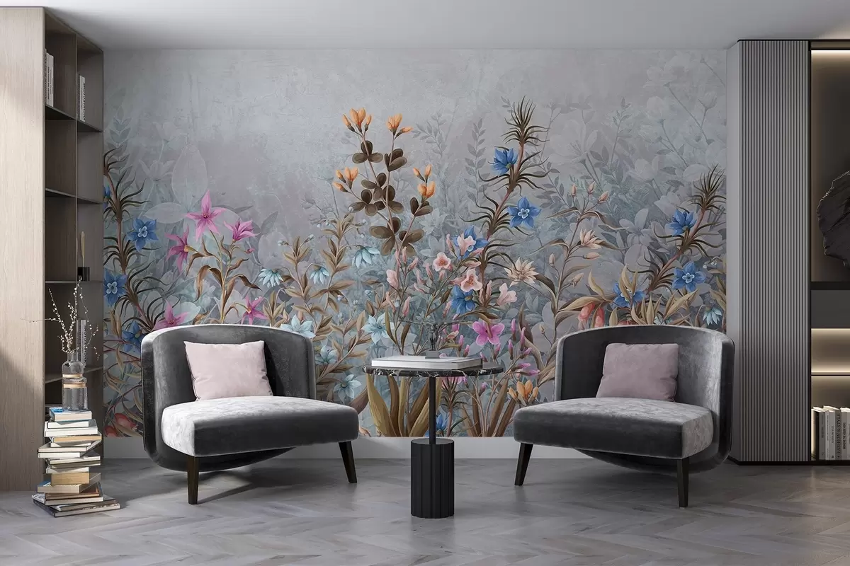 Fototapet Ett frodigt, livfullt blommigt texturtryck med färgglada blommor och växter med invecklade detaljer och texturer Nr. w08428