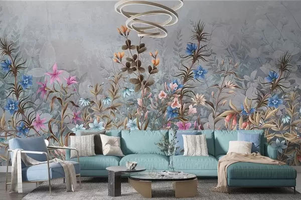 Fototapet Ett frodigt, livfullt blommigt texturtryck med färgglada blommor och växter med invecklade detaljer och texturer Nr. w08428
