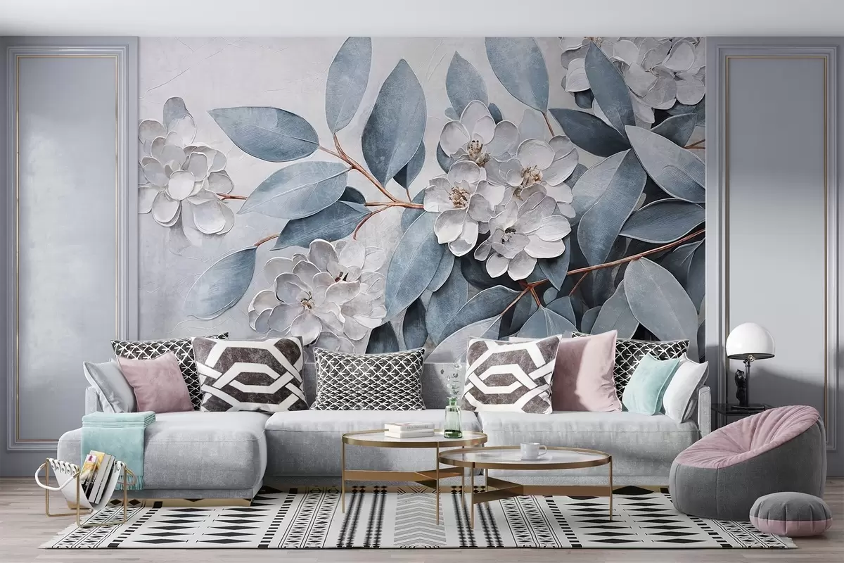 Fototapet Delikata vita blommor med grågröna blad mot en mjuk, dämpad bakgrund i oljemålningsstil Nr. w08437