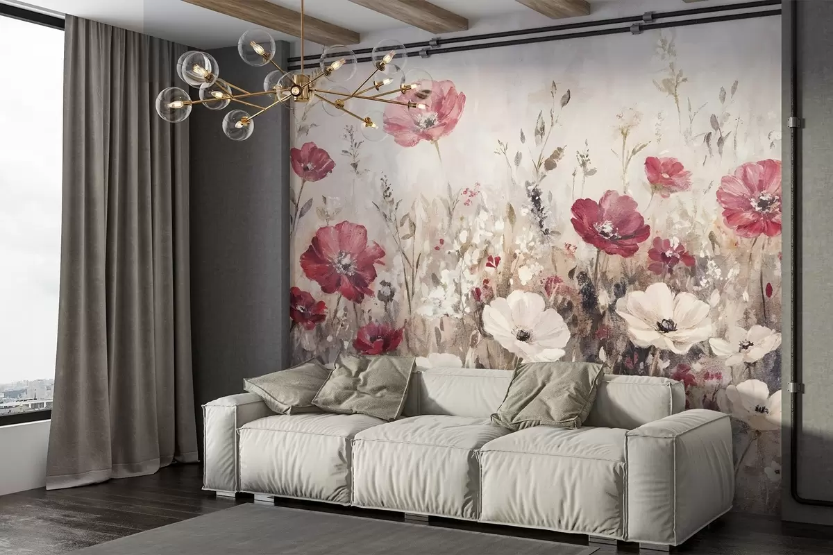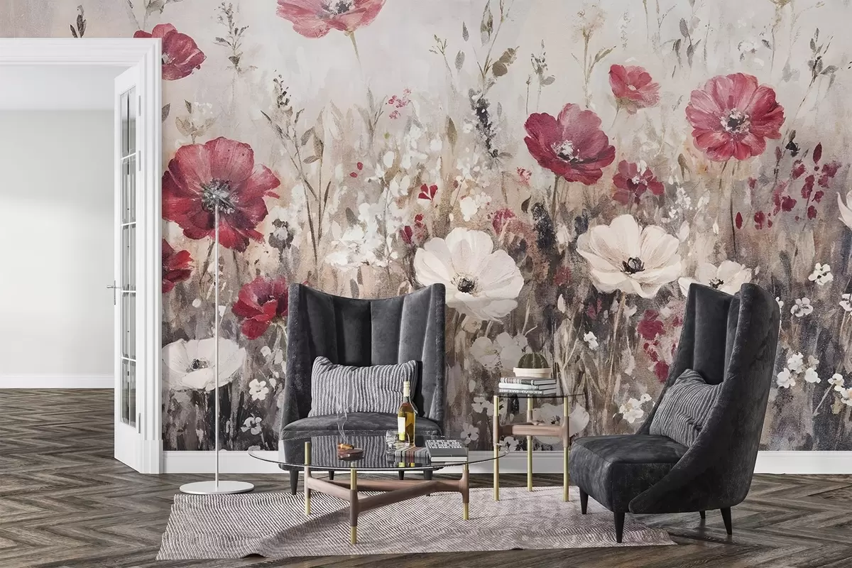 Fototapet Ett fält med livfulla röda och vita blommor mot en mjuk, disig bakgrund i oljemålningsstil Nr. w08438