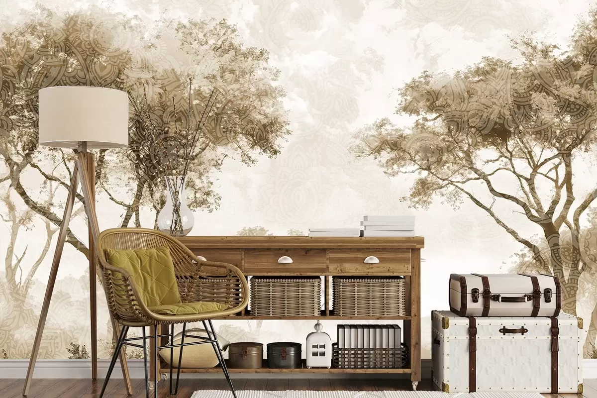 Fototapet Ett dimmigt, fridfullt landskap med träd i siluett i förgrunden och mjuk dimma i nyanser av brunt och beige Nr. w08442v2