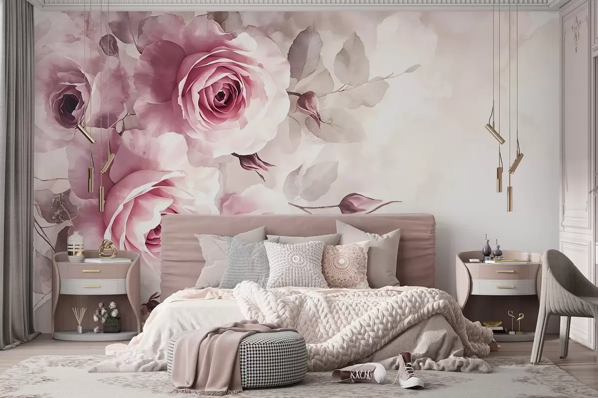 Fototapet Fina pastellrosa rosor och blad med mjuk, suddig bakgrund i akvarellimitation Nr. w08459