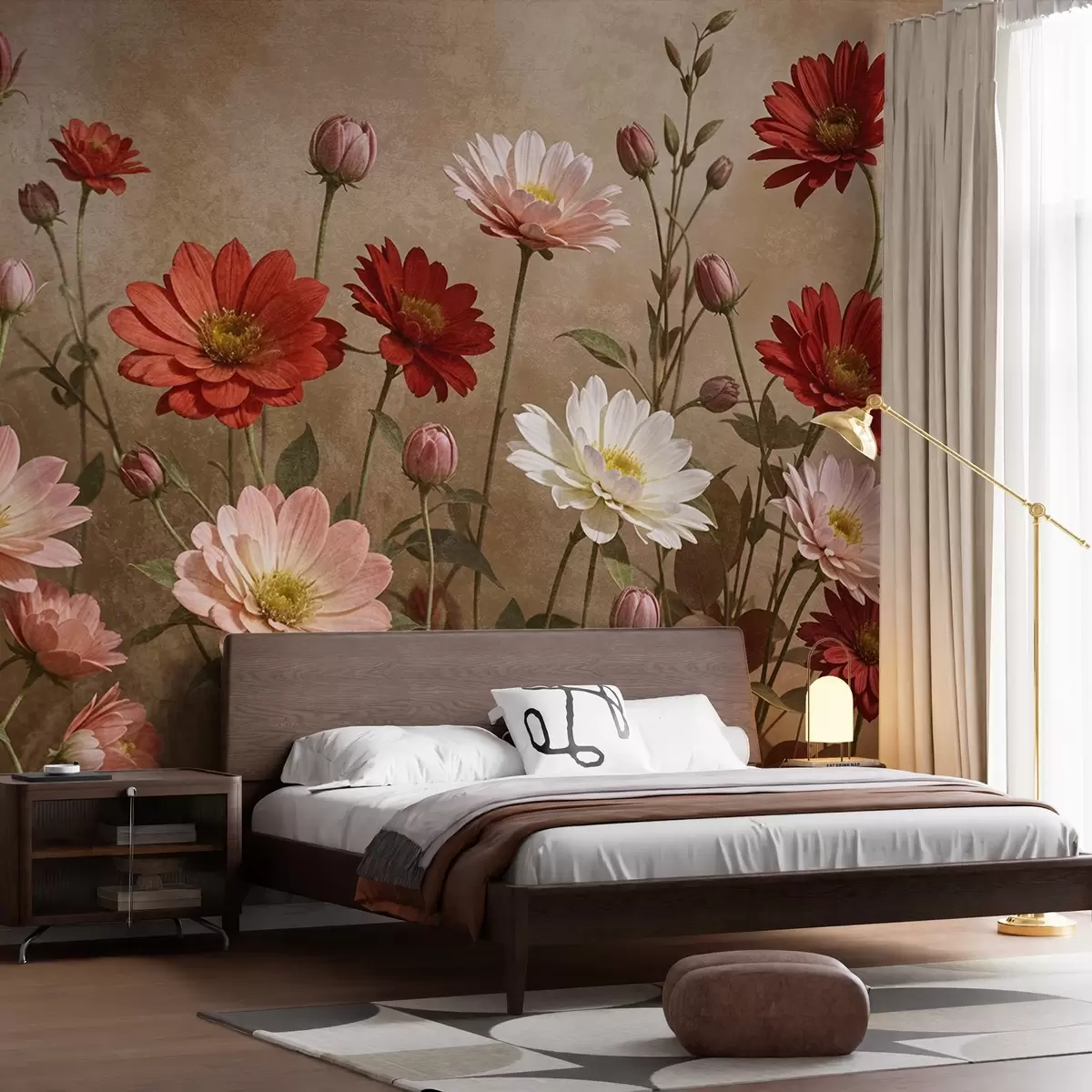 Fototapet Ett fält med färgglada prästkrageliknande blommor i olika nyanser av rosa, rött och vitt mot en strukturerad bakgrund Nr. w08462