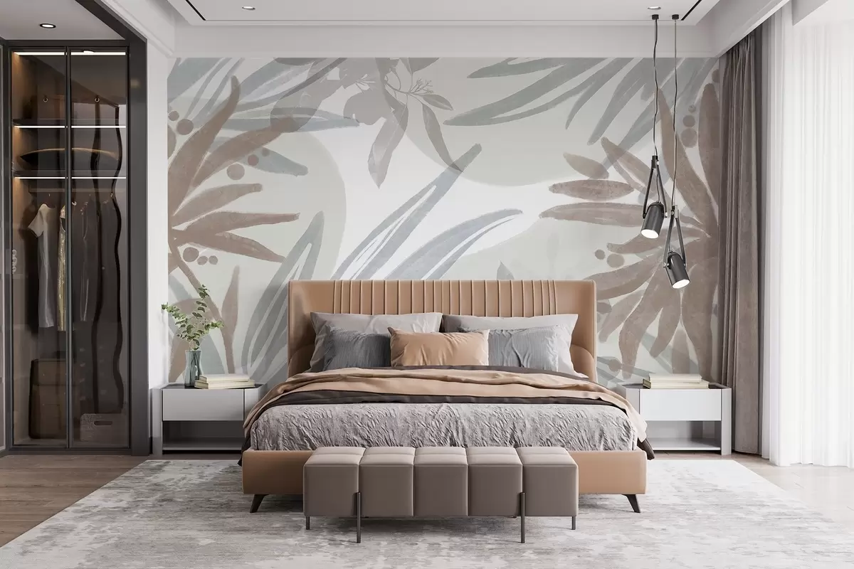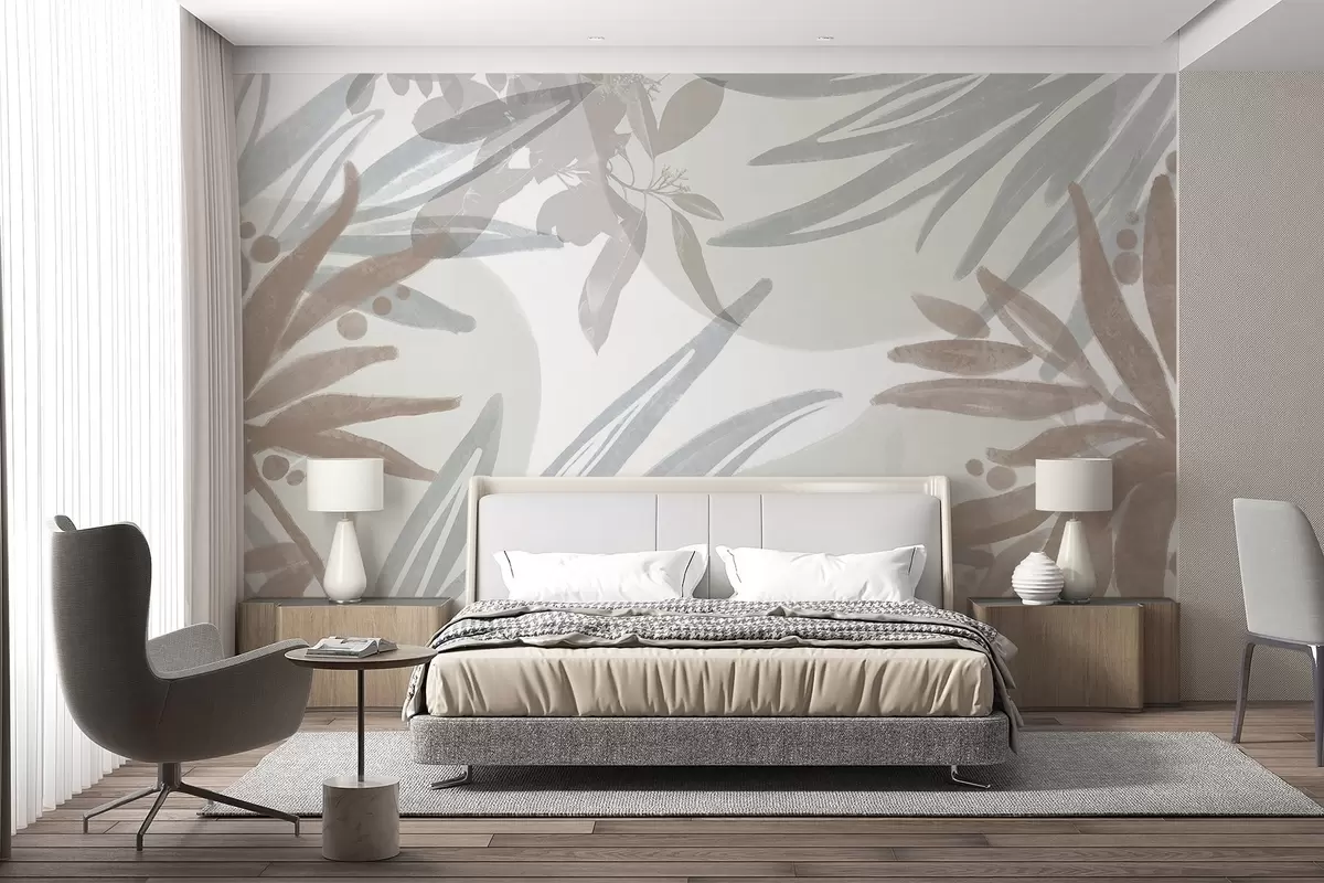 Fototapet Ett neutralt tonat abstrakt blommönster med överlappande blad och former i nyanser av grått, vitt och beige Nr. w08464