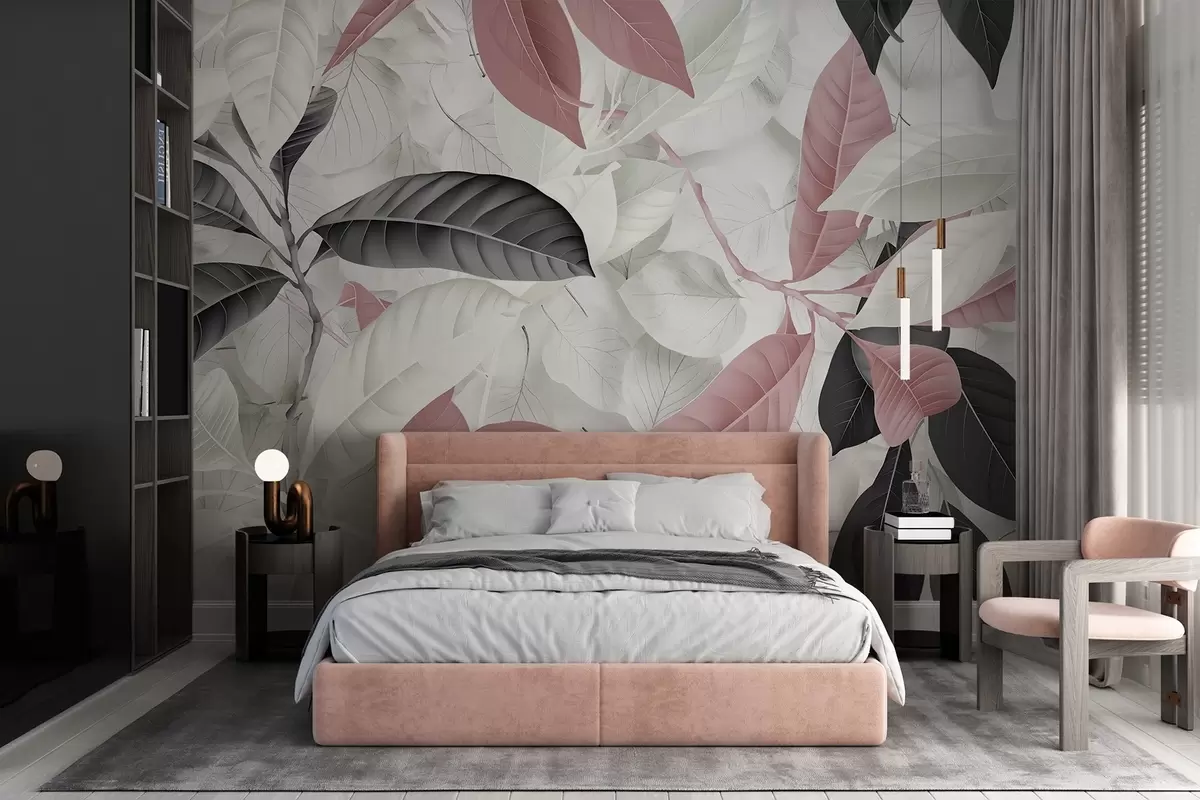 Fototapet Stort tryck av rosa och grå löv mot en bakgrund med ljus lövstruktur, vilket skapar en frodig tropisk känsla Nr. w08468