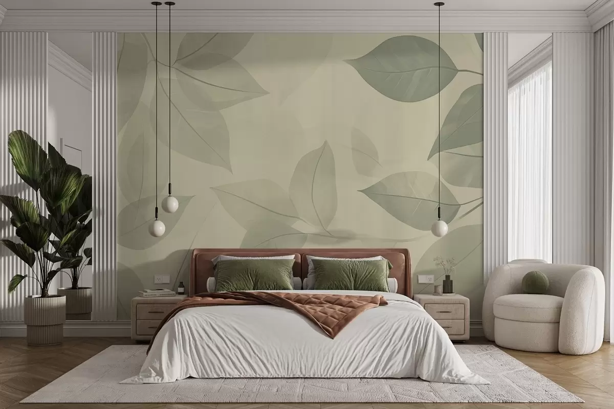 Fototapet Grenar av gröna blad på en mjuk beige bakgrund Nr. w08502v2