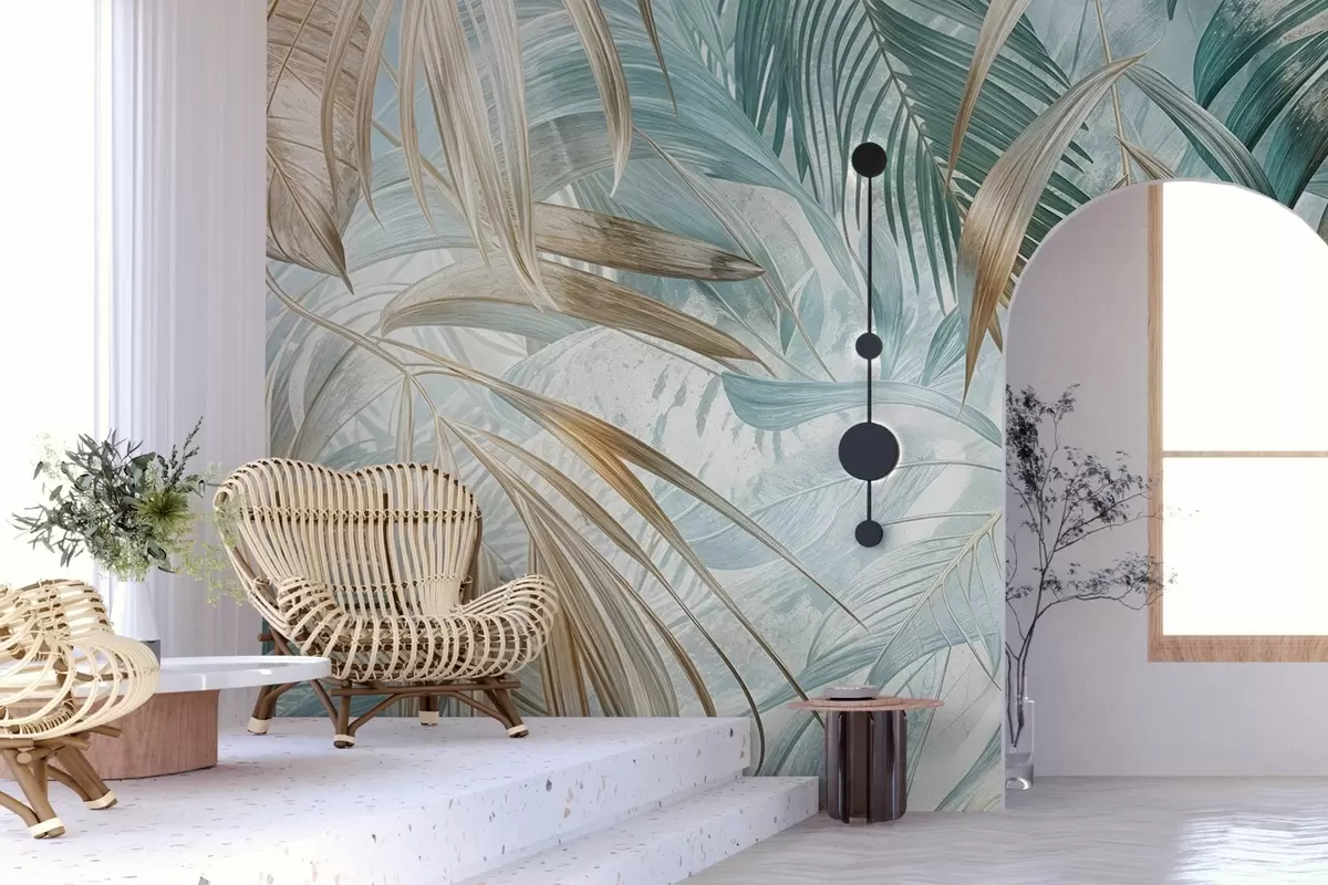 Fototapet Ett tropiskt abstrakt blommönster med stora palmblad i nyanser av blått och beige skapar en frodig atmosfär Nr. w08532