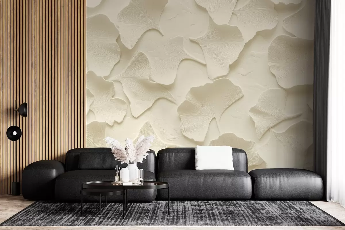 Fototapet Stuckatur med delikat prägling av ginkgoblad på en mjuk beige bakgrund Nr. w08560