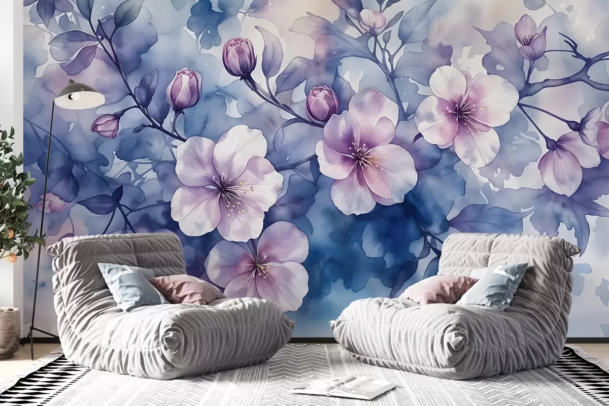 Fototapet Delikat akvarellimitation av rosa och lila blommor med mjuka, suddiga kronblad mot en blå stänkbakgrund Nr. w08582