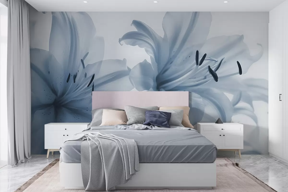 Fototapet Mjukfokuserad närbild av blå minimalistiska liljeblommor mot en ljus bakgrund Nr. w08586