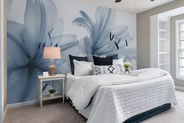 Fototapet Mjukfokuserad närbild av blå minimalistiska liljeblommor mot en ljus bakgrund Nr. w08586