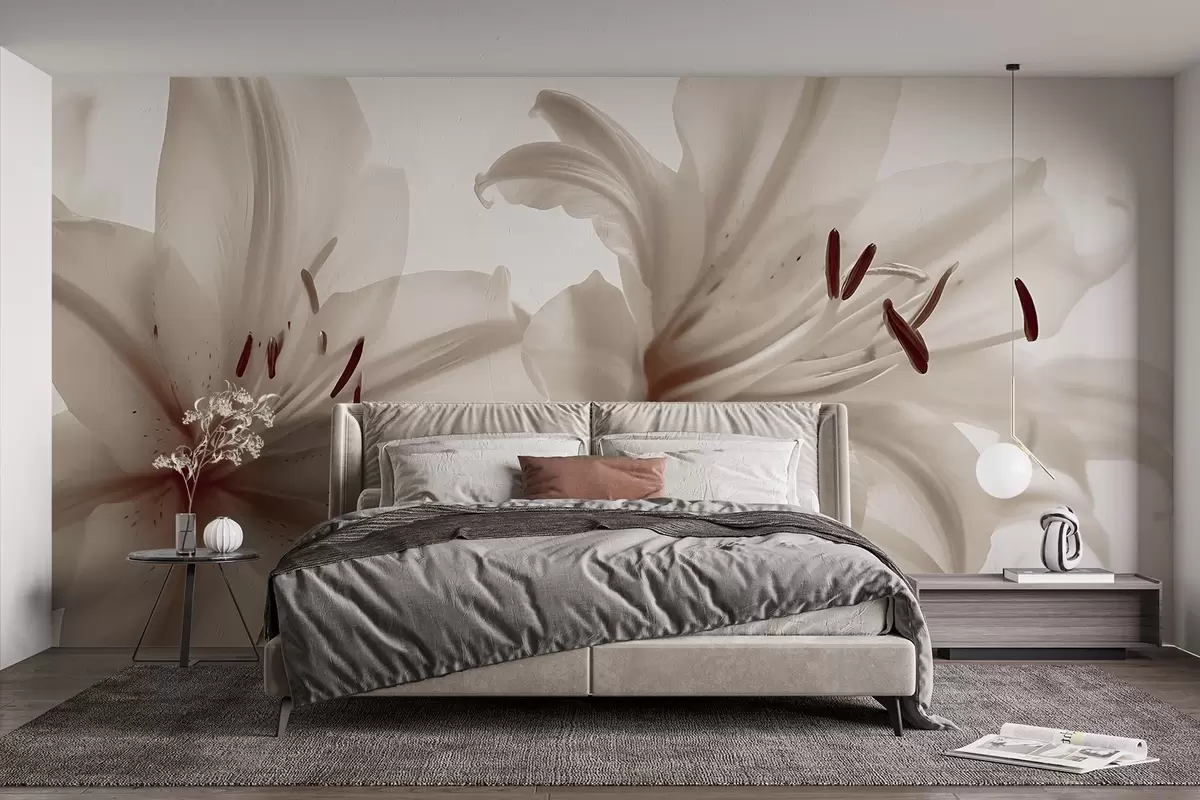 Fototapet Mjukfokuserad närbild av beige minimalistiska liljeblommor mot en ljus bakgrund Nr. w08586v1