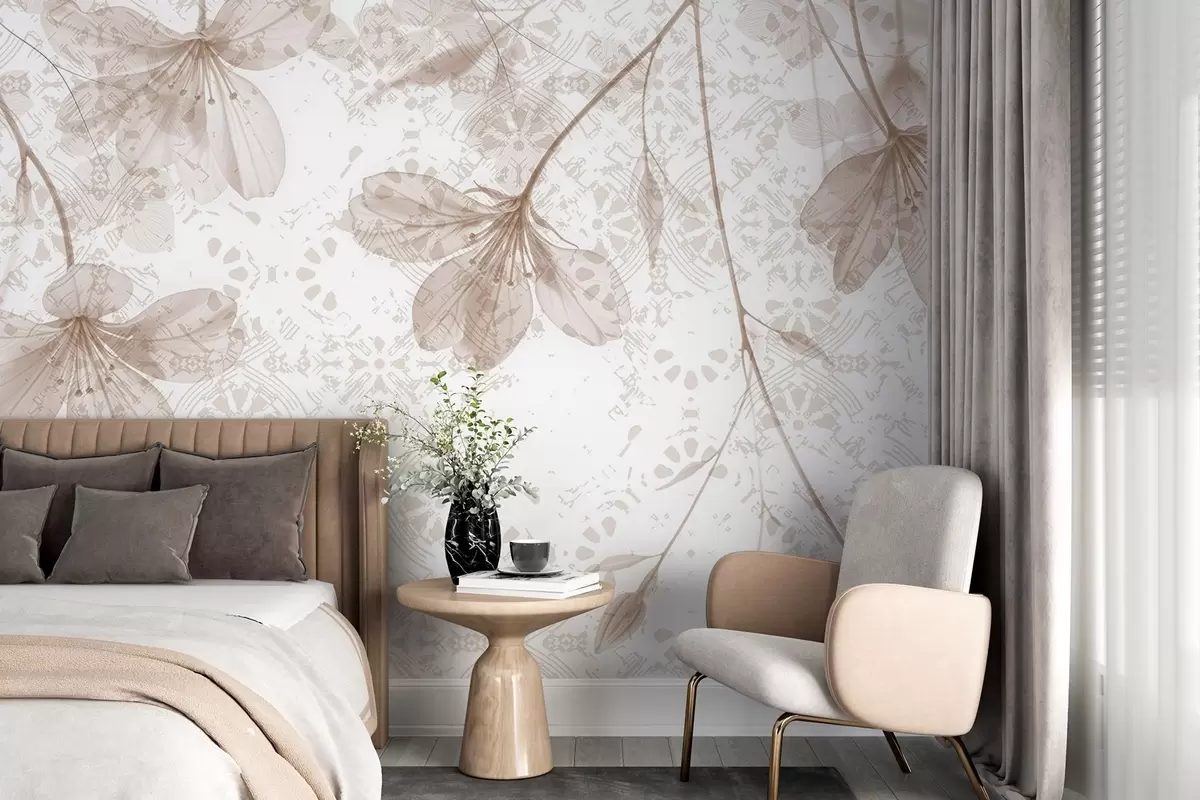 Fototapet Delikata beige och vita blommor med långa stjälkar och kronblad mot en mjuk, oskarp texturbakgrund Nr. w08588v1