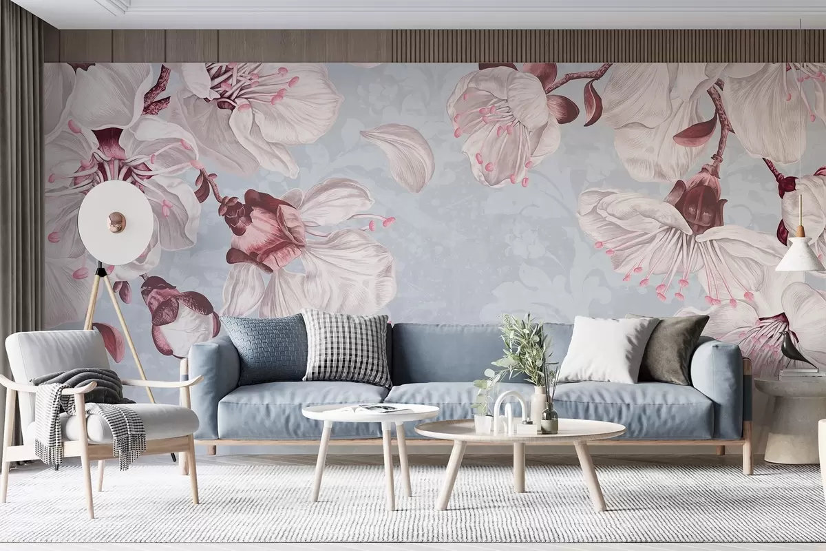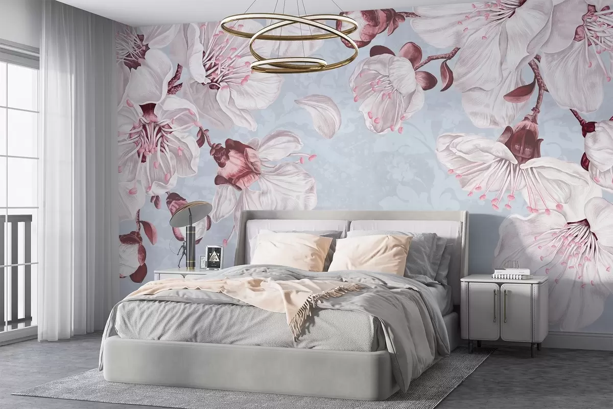 Fototapet Ett blommigt tryck med stora rosa och vita körsbärsblommor mot en ljusblå texturbakgrund Nr. w08601