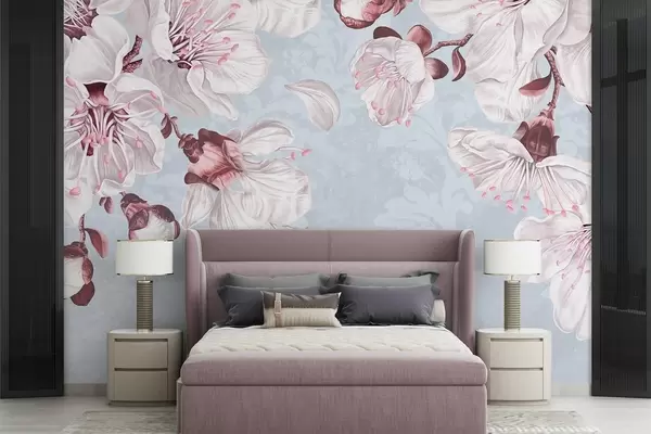 Fototapet Ett blommigt tryck med stora rosa och vita körsbärsblommor mot en ljusblå texturbakgrund Nr. w08601