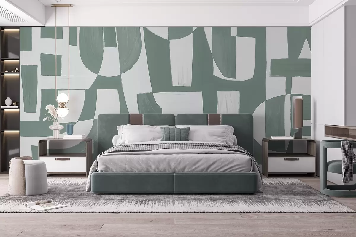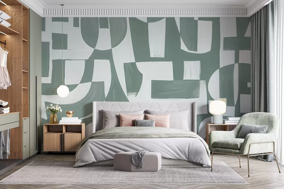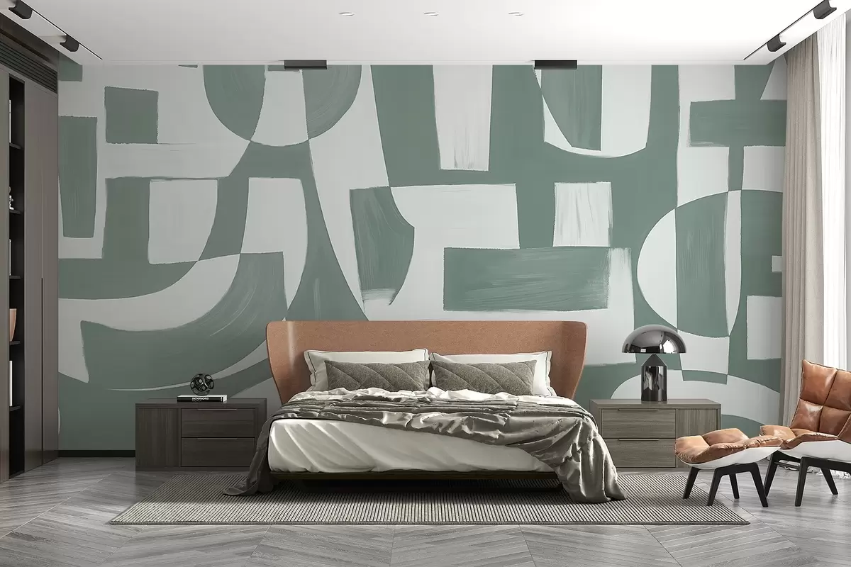 Fototapet Abstrakta geometriska former och mönster i grönt och vitt, vilket skapar en visuellt slående och dynamisk komposition Nr. w08608v1