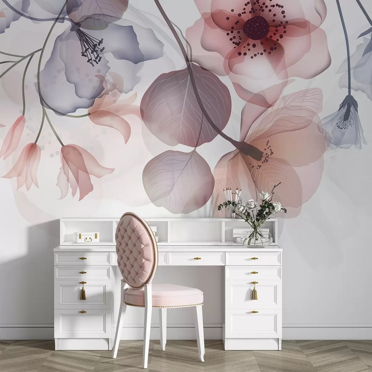 Fototapet Delikata rosa och grå genomskinliga blommor med mjuka kronblad och mörka centra, mot en ljus bakgrund Nr. w08613