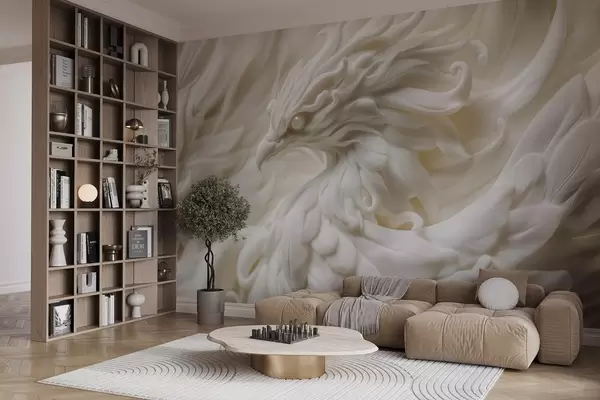 Fototapet En fågel med långa fjädrar i stucco-stil i beige toner Nr. w08629