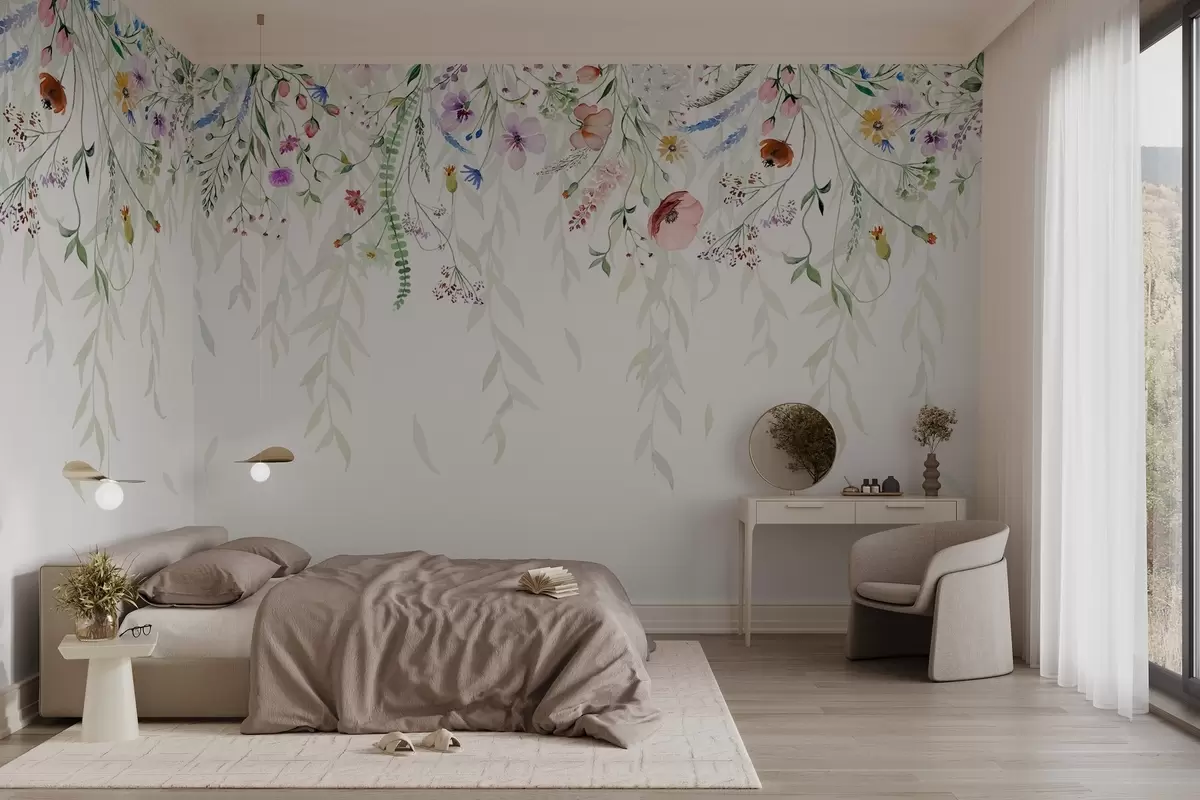 Fototapet Ett färgglatt blommönster som faller ner med olika blommor, blad och växter i akvarellstil Nr. w08646