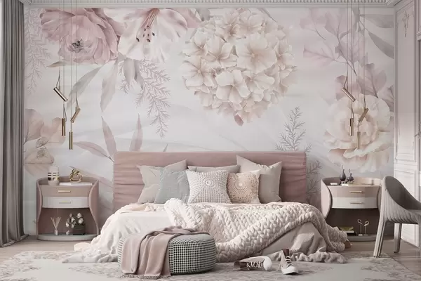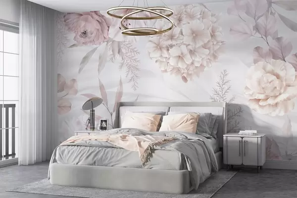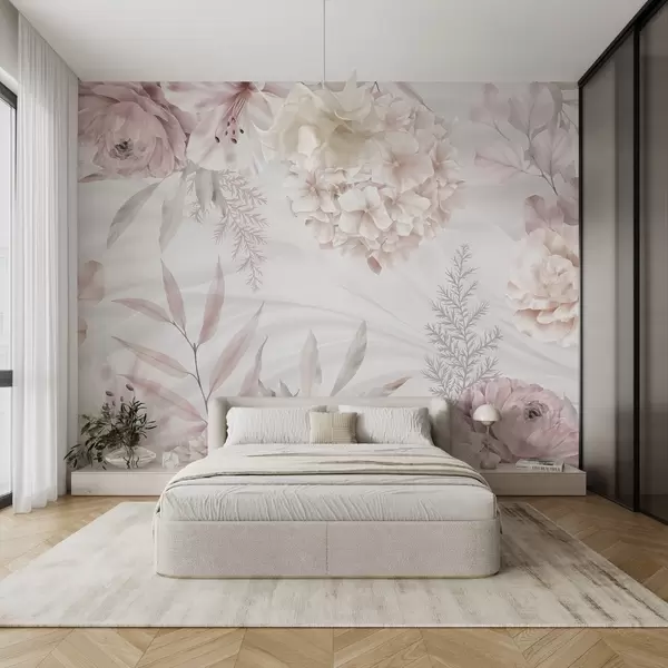 Fototapet Ett mjukt, abstrakt blomstertryck med stora rosa och vita blommor, skira blad och en dämpad pastellfärgpalett Nr. w08651