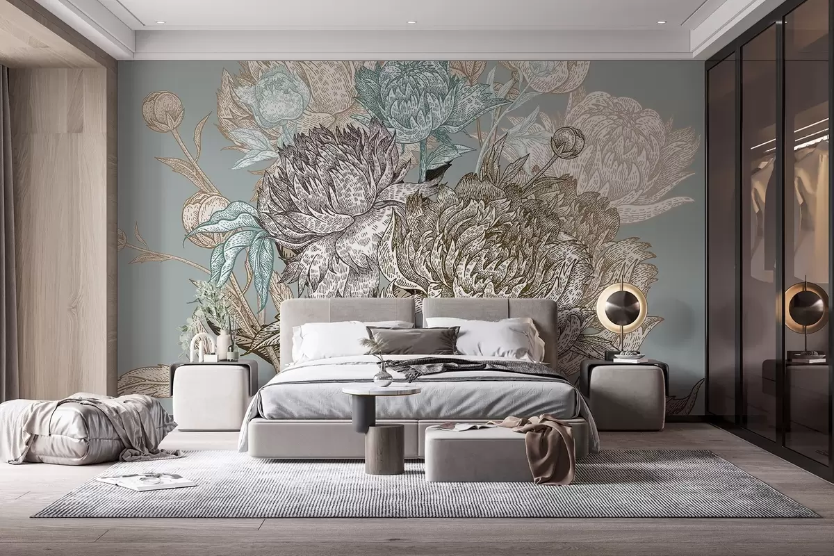 Fototapet En detaljerad blommig linjemönster med stora pioner och blad i nyanser av blått, beige och brunt Nr. w08663