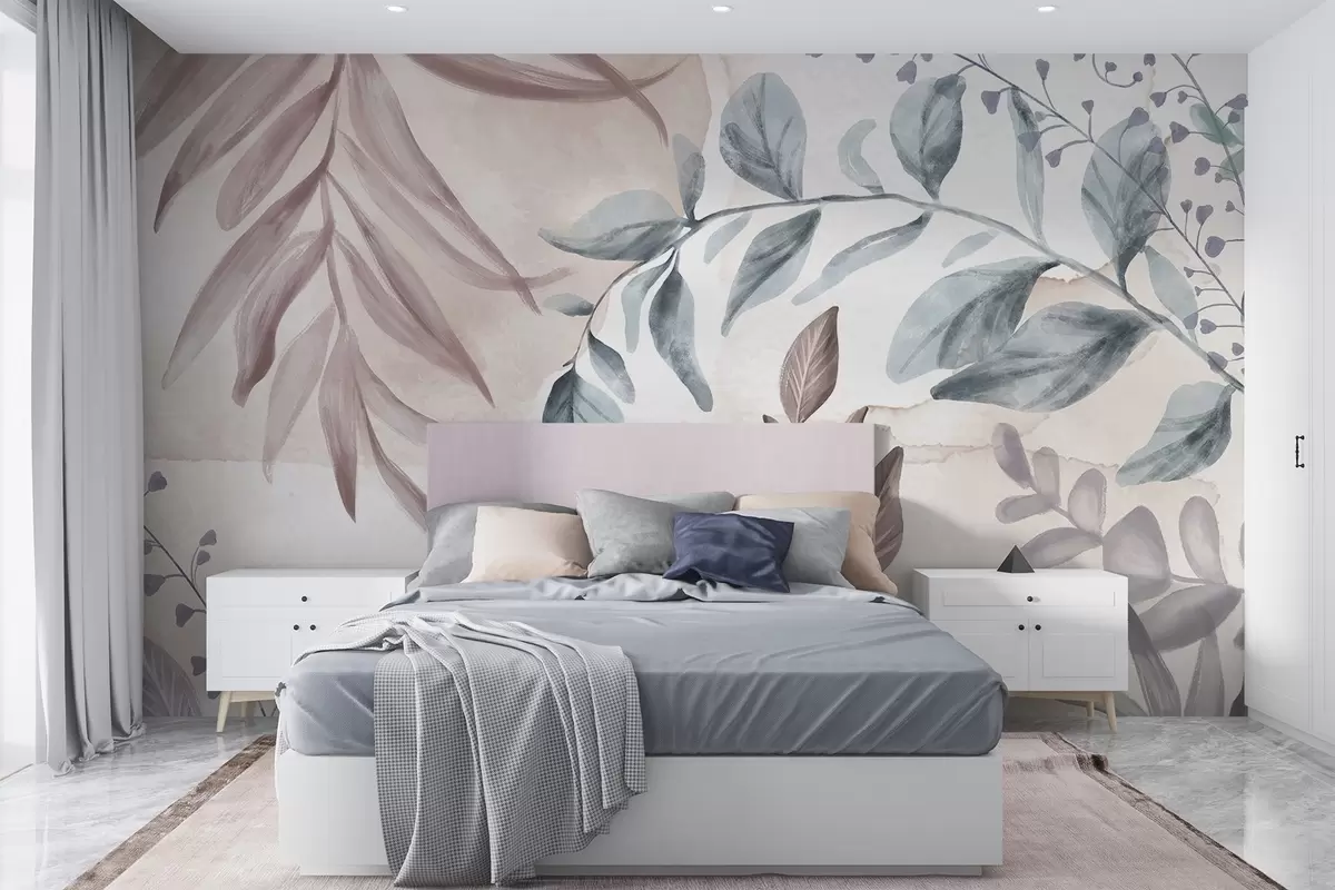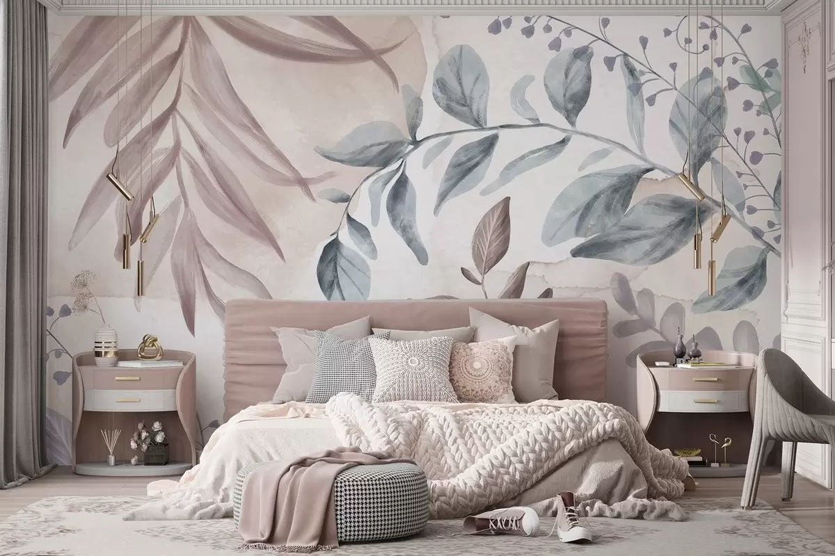Fototapet Botaniskt tryck med blad och blomgrenar i mjuka pastellfärger, på akvarellliknande bakgrund Nr. w08668