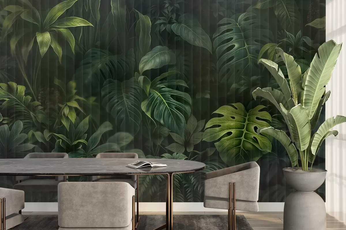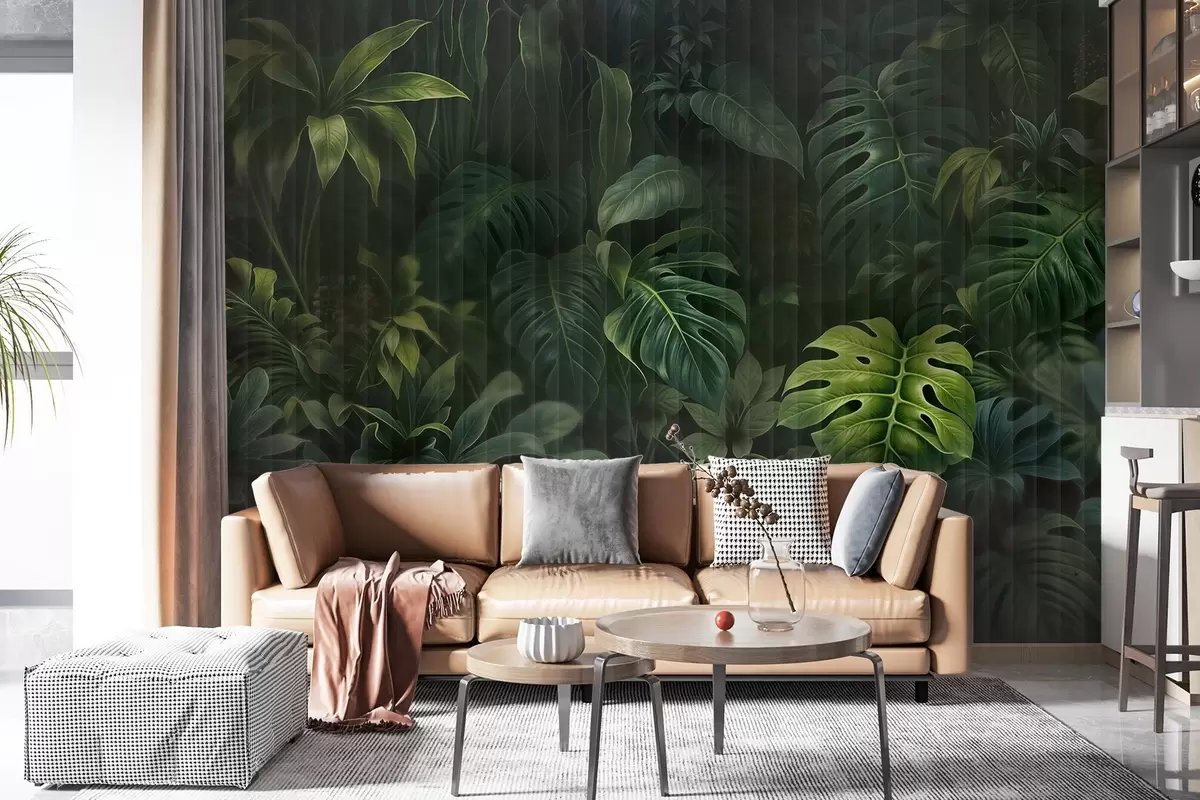 Fototapet Tropiskt mörkt suddigt och texturerat tryck med olika gröna blad, inklusive monstera och palmblad w08673
