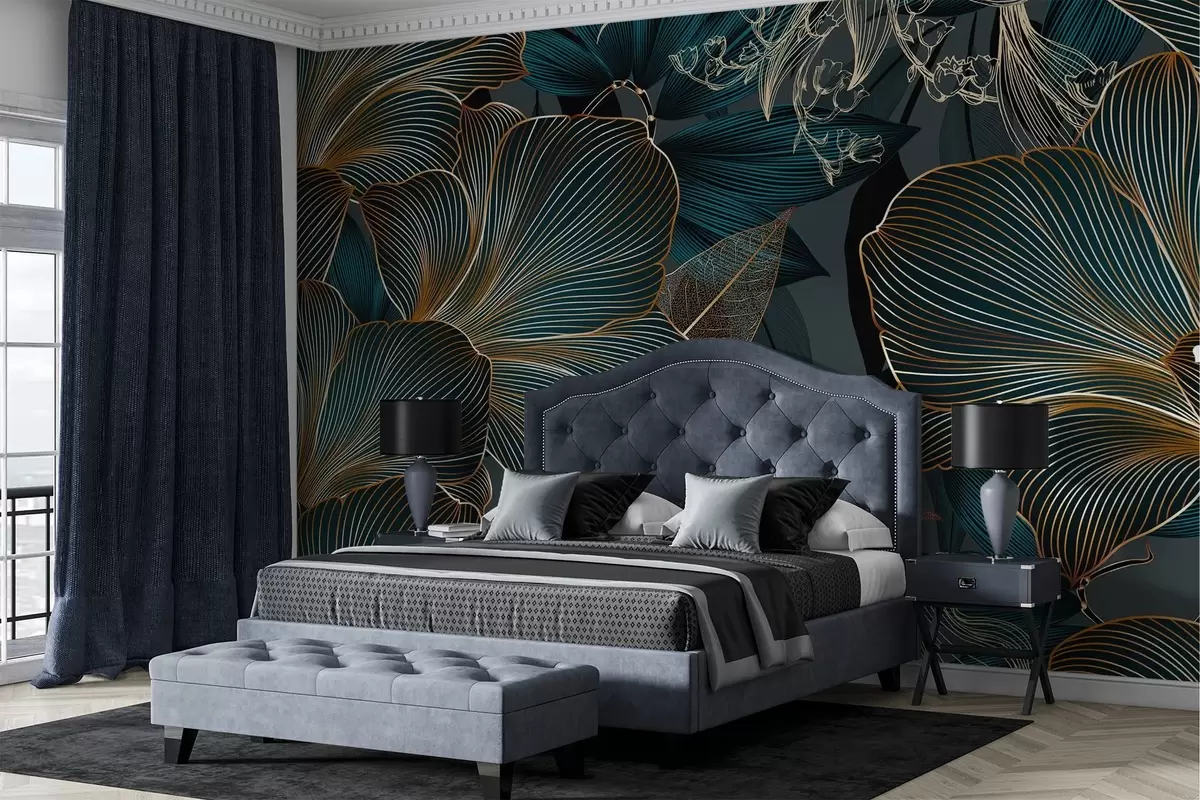 Fototapet Stiliserade blommor och blad med intrikata linjer i nyanser av blågrönt och gult på mörk bakgrund Nr. w08675