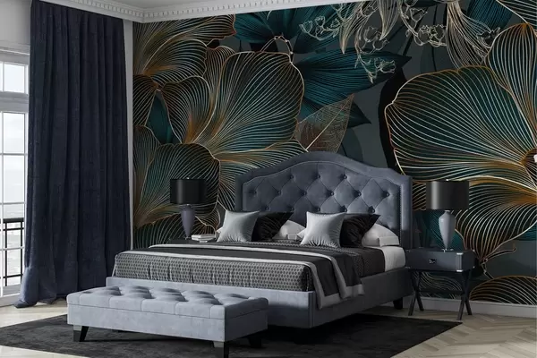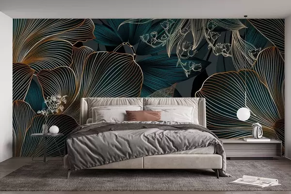 Fototapet Stiliserade blommor och blad med intrikata linjer i nyanser av blågrönt och gult på mörk bakgrund Nr. w08675