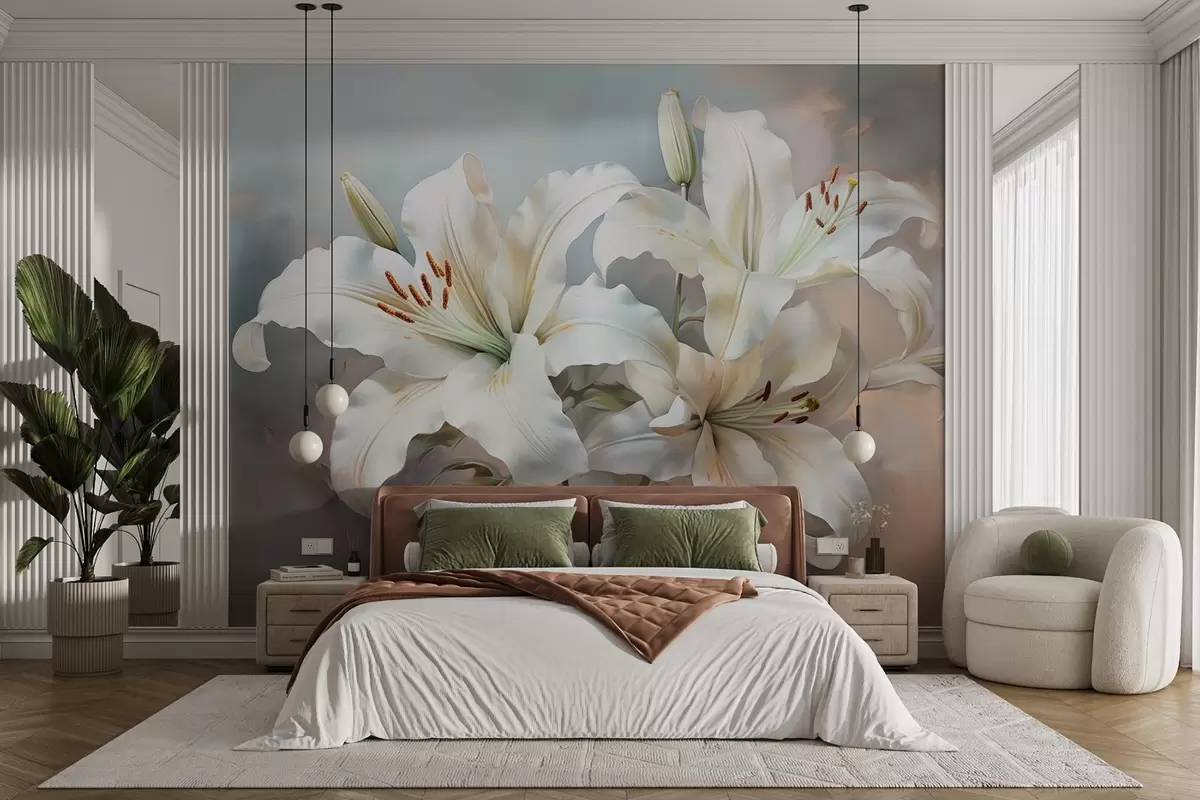 Fototapet Eleganta vita liljor i pastellfärger med en textur som efterliknar penseldrag Nr. w08678