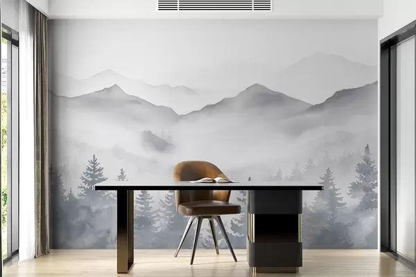 Fototapet Fridfullt bergslandskap med dimmiga skogar i mjuka grå och blå toner Nr. w08680