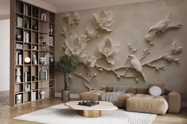 Fototapet 3D magnoliagrenar med fåglar på Nr. w08690