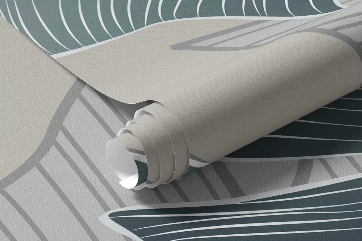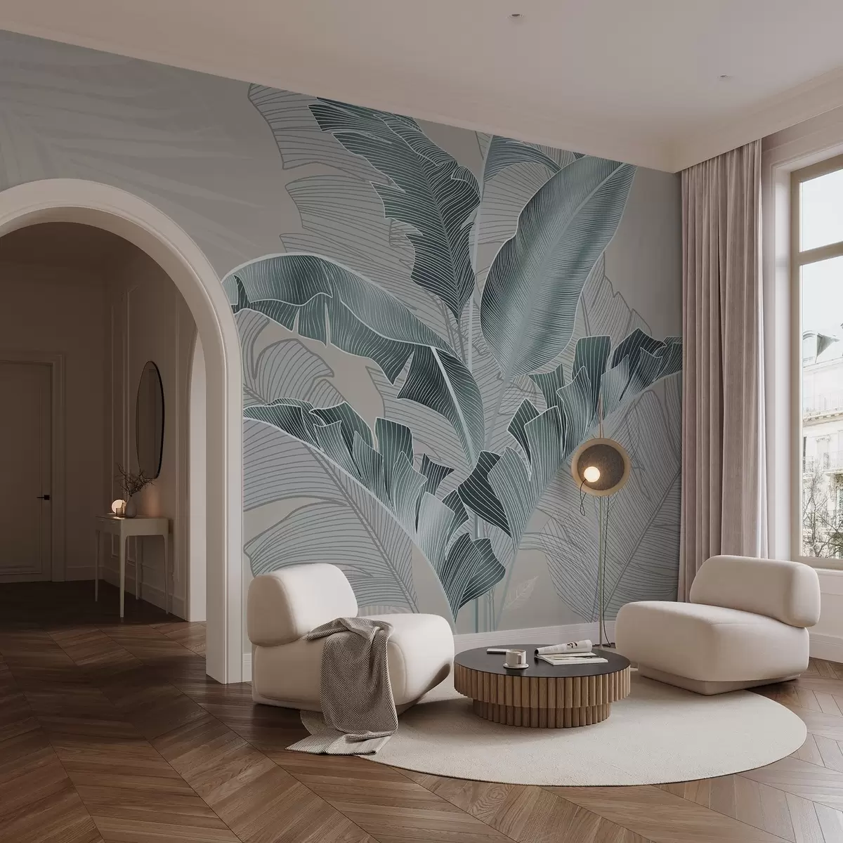 Fototapet En harmonisk komposition av tropiska blad i nyanser av beige och turkos, med detaljerat linjearbete Nr. w08698v1