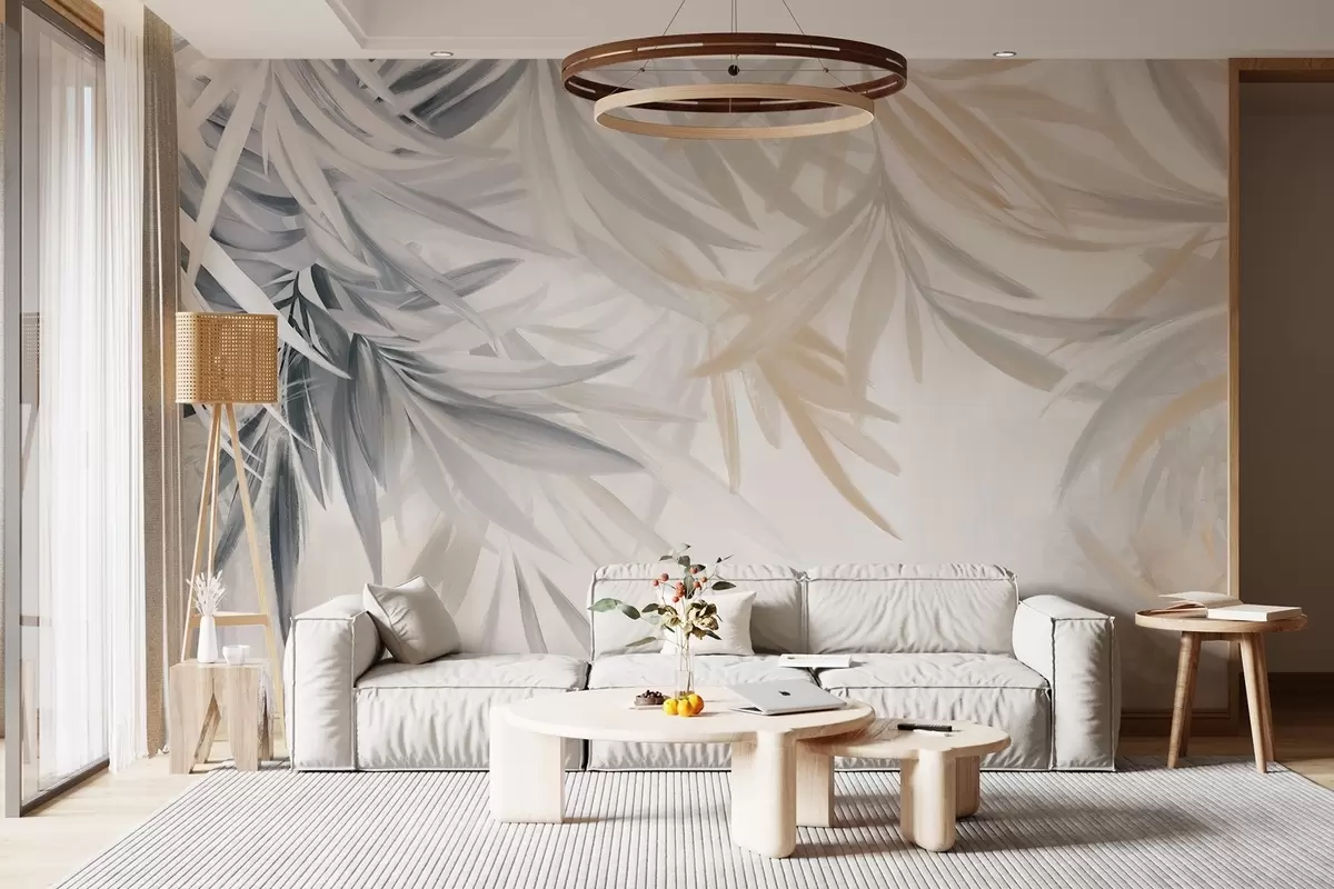 Fototapet Mjuka, böljande, ljusa tropiska blad i grå och persikofärgade nyanser som smälter in i ett blekt, neutralt tryck Nr. w08703