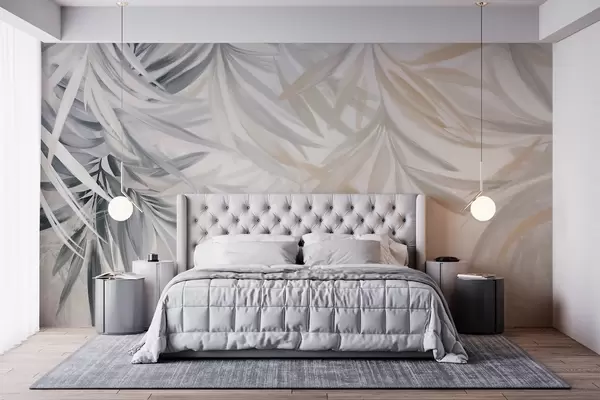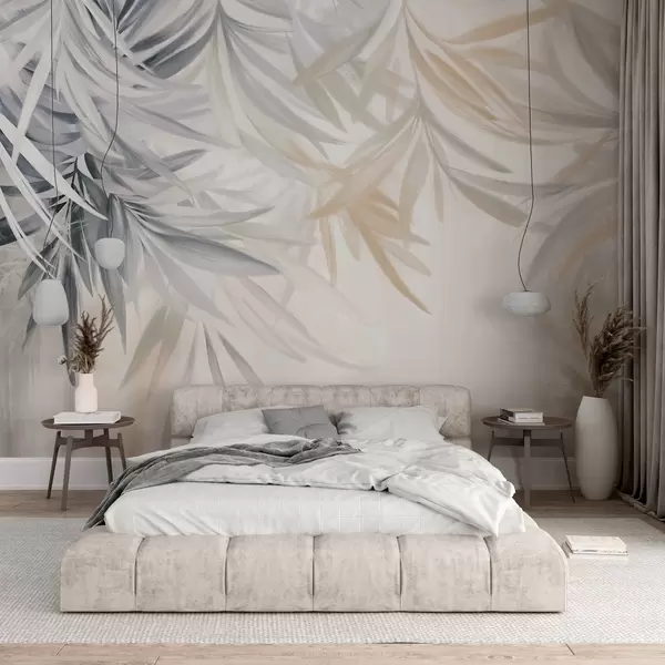 Fototapet Mjuka, böljande, ljusa tropiska blad i grå och persikofärgade nyanser som smälter in i ett blekt, neutralt tryck Nr. w08703