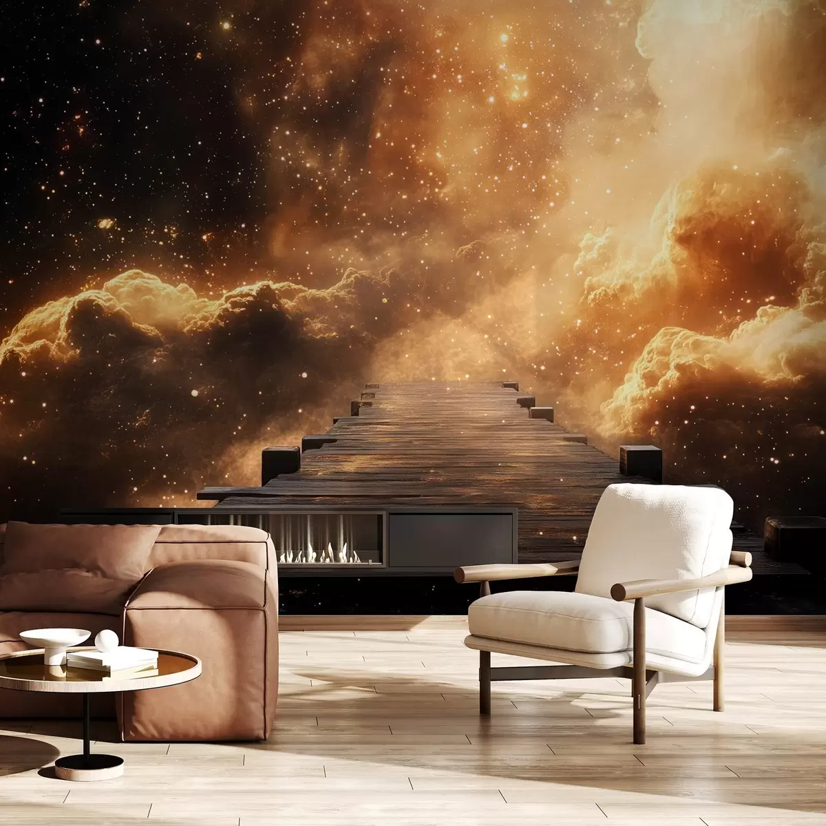 Fototapet Kosmisk gul-svart stjärnhimmel med en träbrygga Nr. w08723