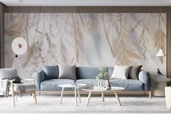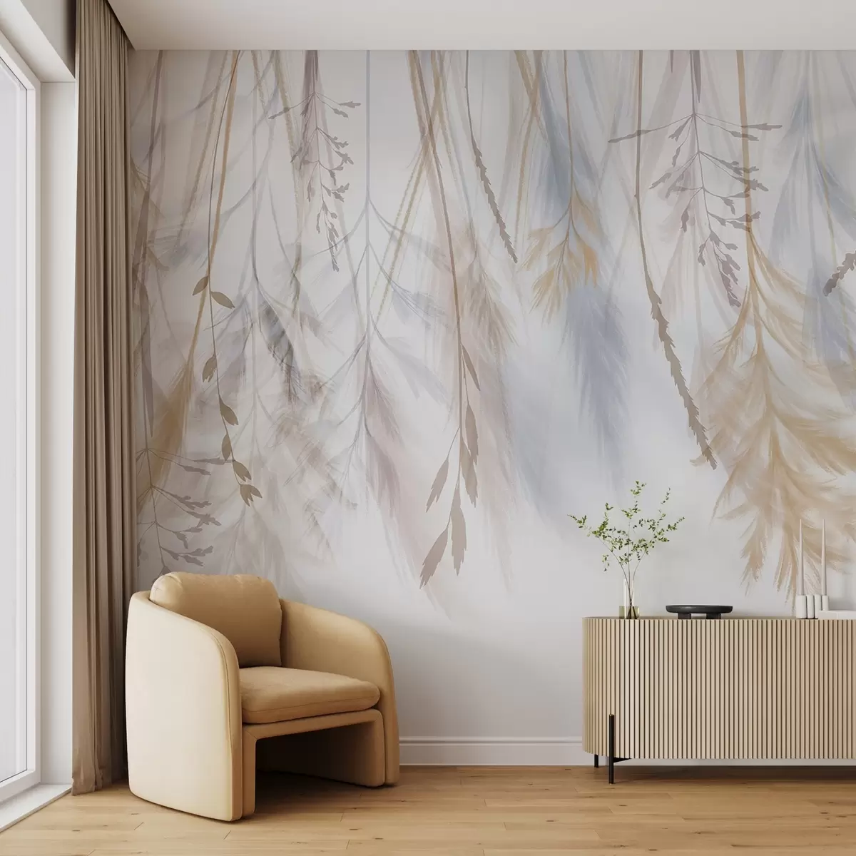 Fototapet Fina gräs, spikelets och växter i pastellfärger, arrangerade i ett kaskadmönster mot en ljus bakgrund Nr. w08737