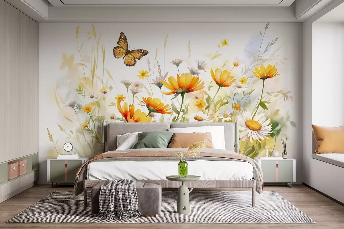 Fototapet Ett livfullt akvarellliknande blomsterfält med orange och gula blommor och en fjäril ovanför blommorna Nr. w08739
