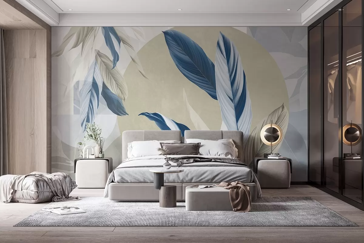 Fototapet Modern och abstrakt geometrisk texturkomposition med detaljerade blad i nyanser av blått, beige och vitt Nr. w08741