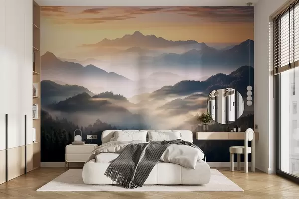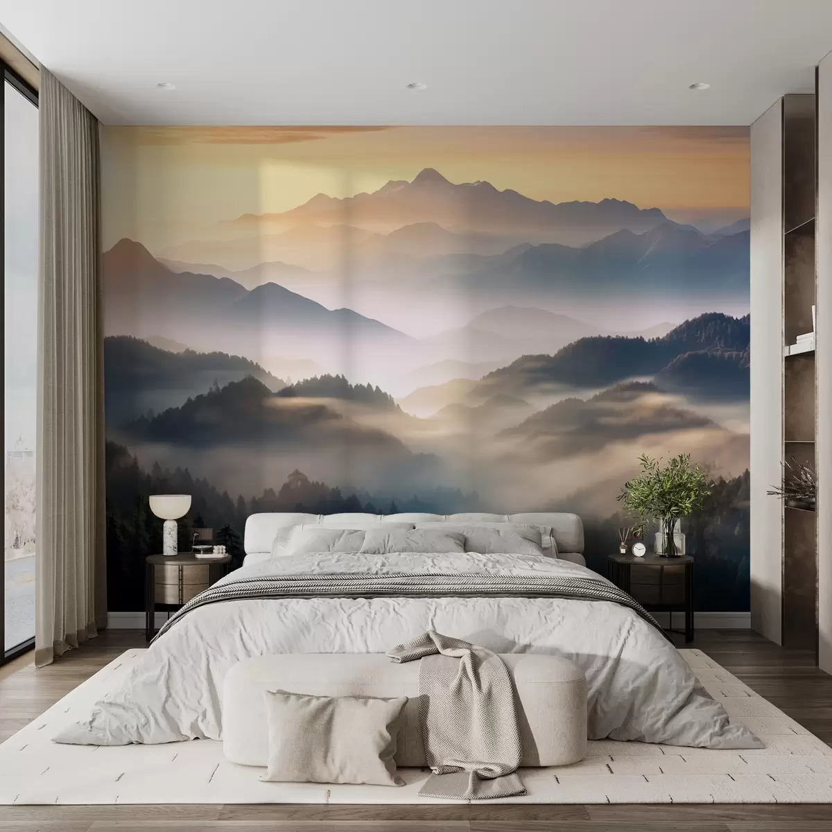Fototapet Fridfullt bergslandskap i gryningen, med mjuk dimma som omsluter tallarna Nr. w08748