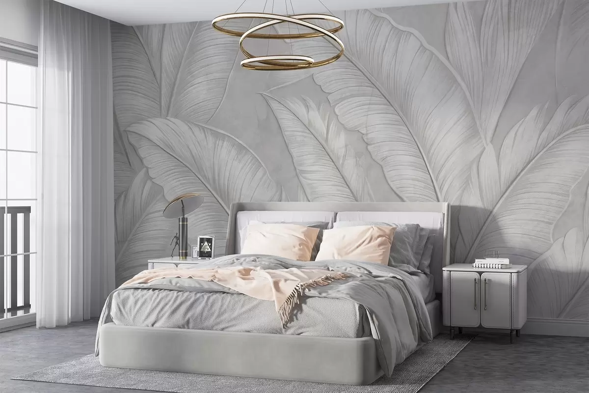 Fototapet Mycket texturerade detaljerade stora tropiska blad i en monokromatisk ljusgrå färg i loftstil Nr. w08772
