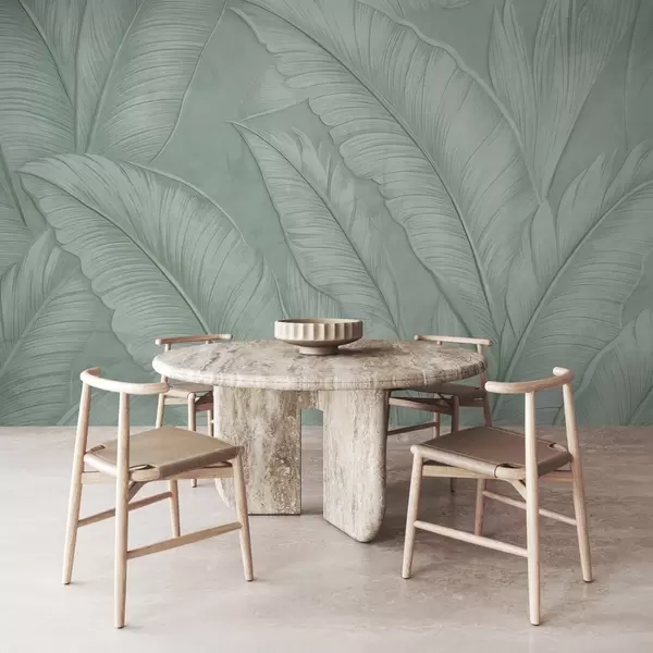 Fototapet Mycket texturerade detaljerade stora tropiska blad i en monokromatisk grön färg i loftstil Nr. w08772v1